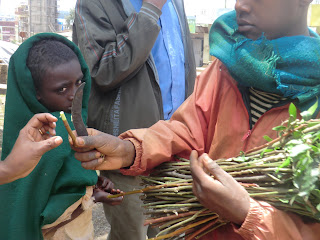 The bus stopped in a town on the journey from Addis Ababa to Bahir Dar. I bought a toothbrush from this little boy for 5 cents, which he cut to length on the spot and carved the bark off with his knife. Many people here clean their teeth with the end of this plant.